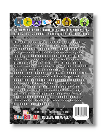 It's Christmas Eve, and Dr. Steinbeck (a Multiburp variant of the amazing Mr. Stickerbomb), being the terrible father and person that he is, has once again failed to get his kid a gift. In a panic, he uses his latest mad scientist gizmos to break into Toys-R-Not-Us to steal something—anything—to get himself out of trouble. Of course, it all goes wrong. The gadgets warp the space-time continuum, and now all the toys and assorted consumer goods have morphed and melded into PUNKOS—sentient little oddities that are trapped inside the crumbling mall, screaming to get out before the whole place explodes. It's your job to rescue the Punkos and get them under the Christmas tree before morning.